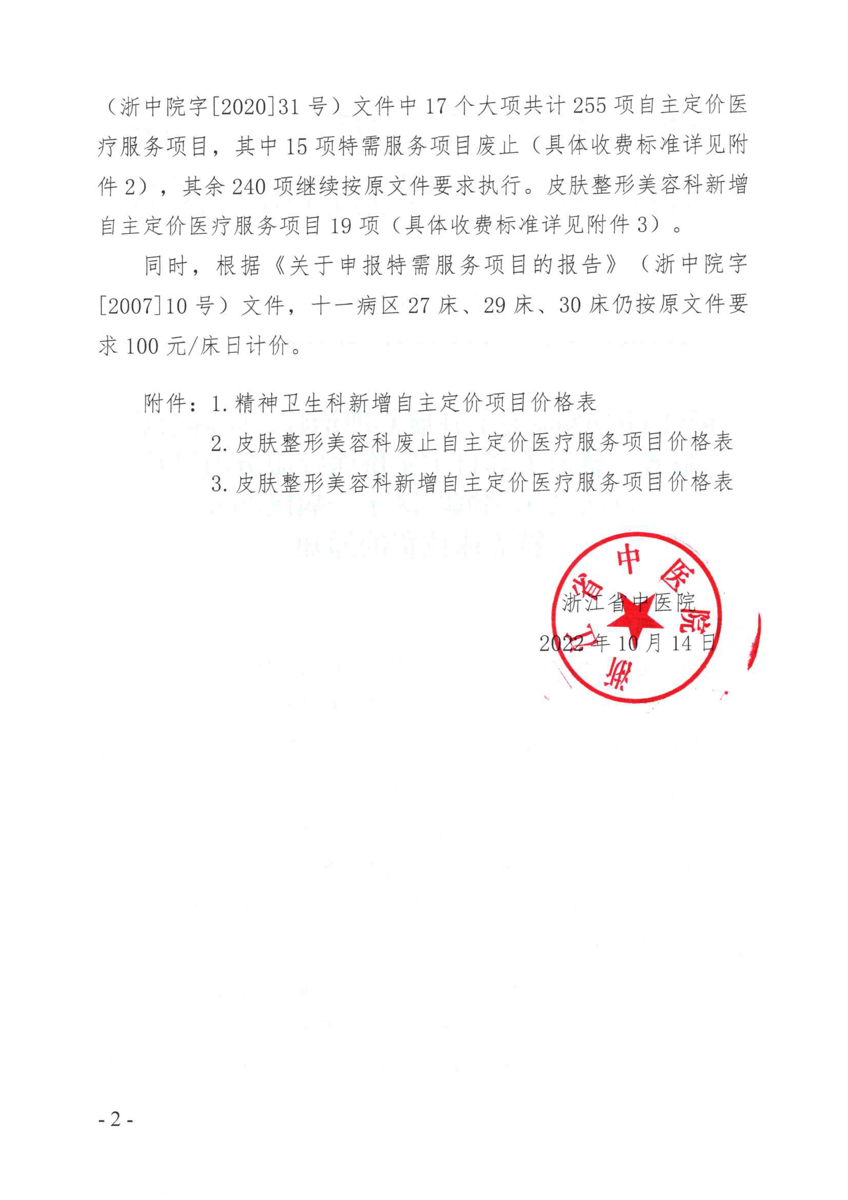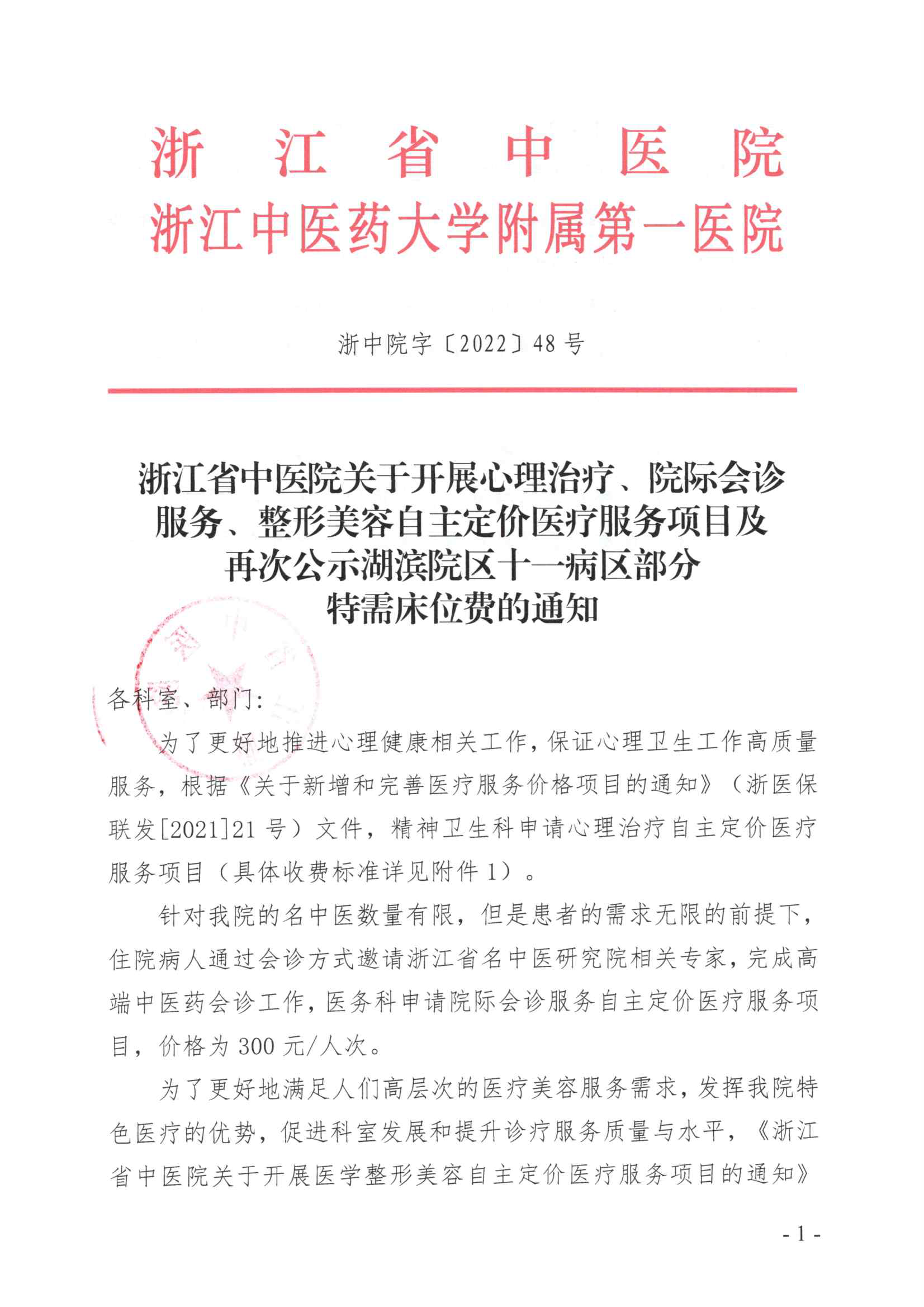 浙中院字〔2022〕48号浙江省中医院关于开展心理治疗、院际会诊服务、整形美容自主定价医疗服务项目及