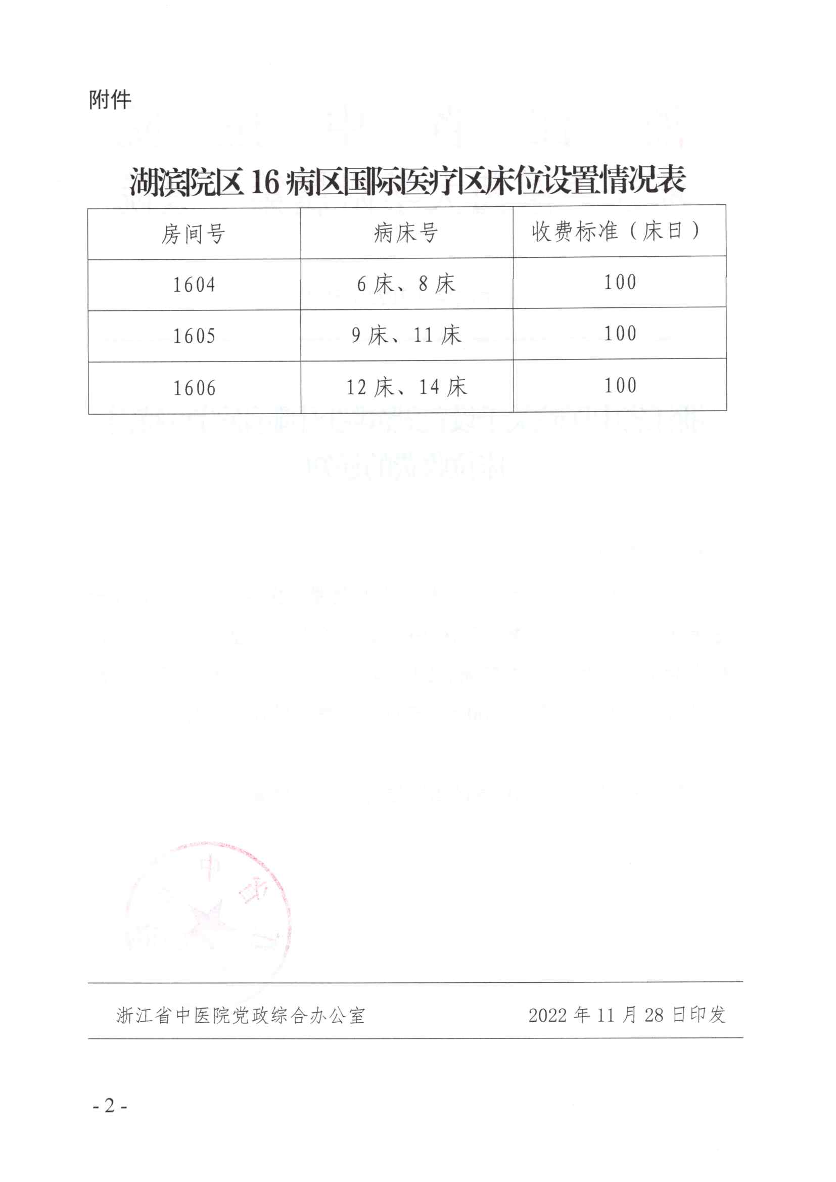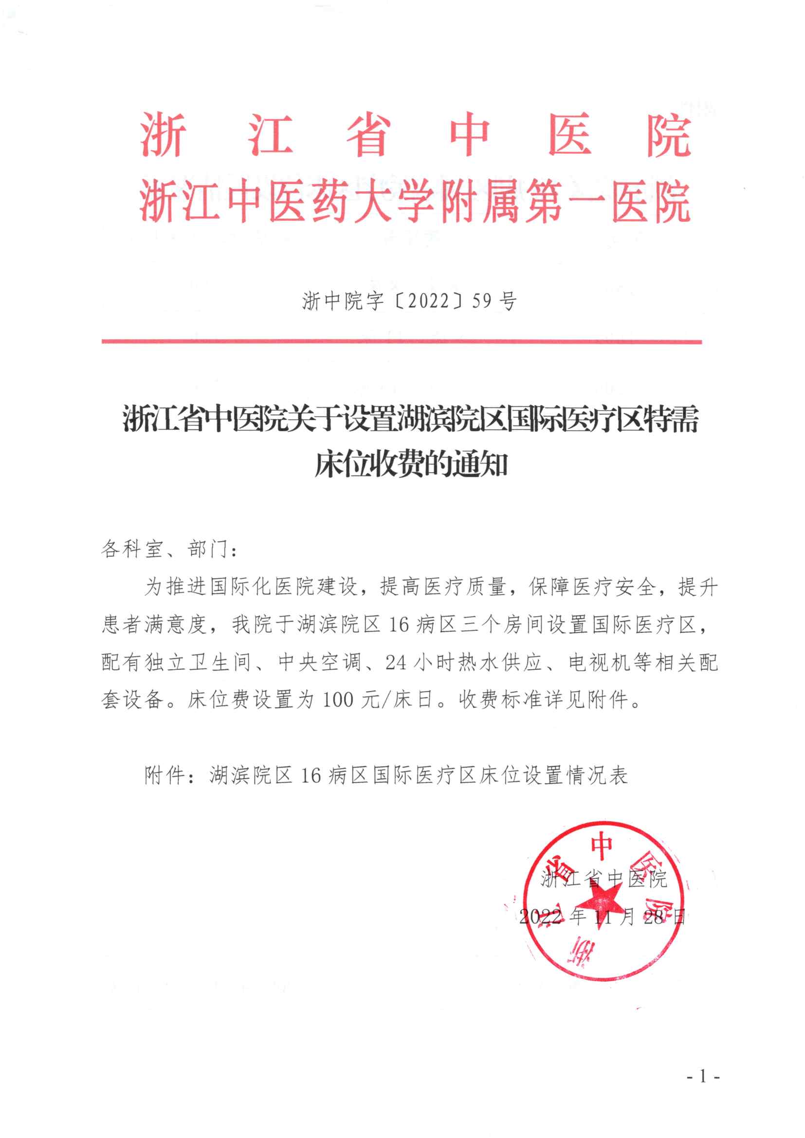 浙中院字〔2022〕59号 浙江省中医院关于设置湖滨院区国际医疗区特需床位收费的通知