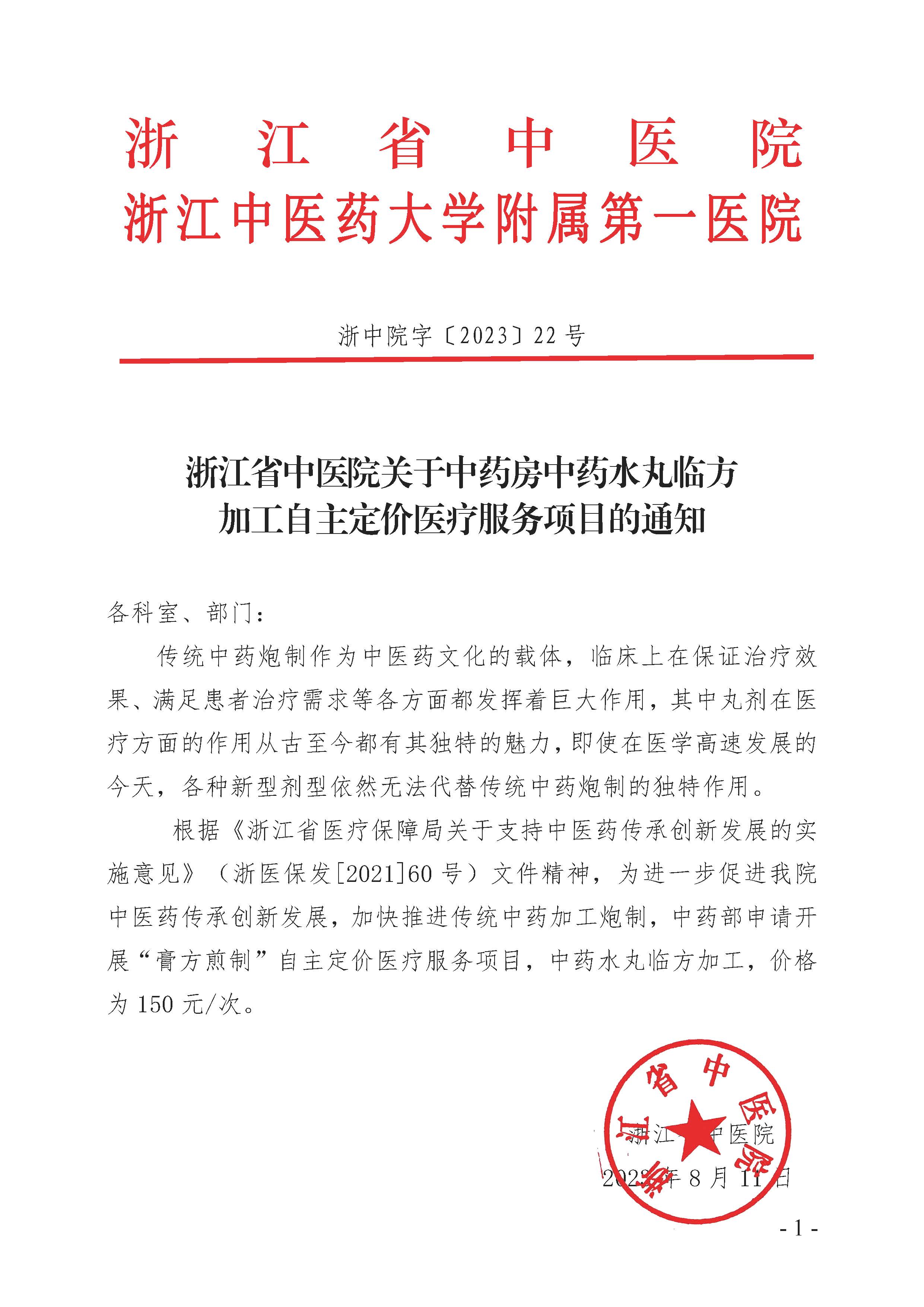 浙中院字〔2023〕22号 浙江省中医院关于中药房中药水丸临方加工自主定价医疗服务项目的通知