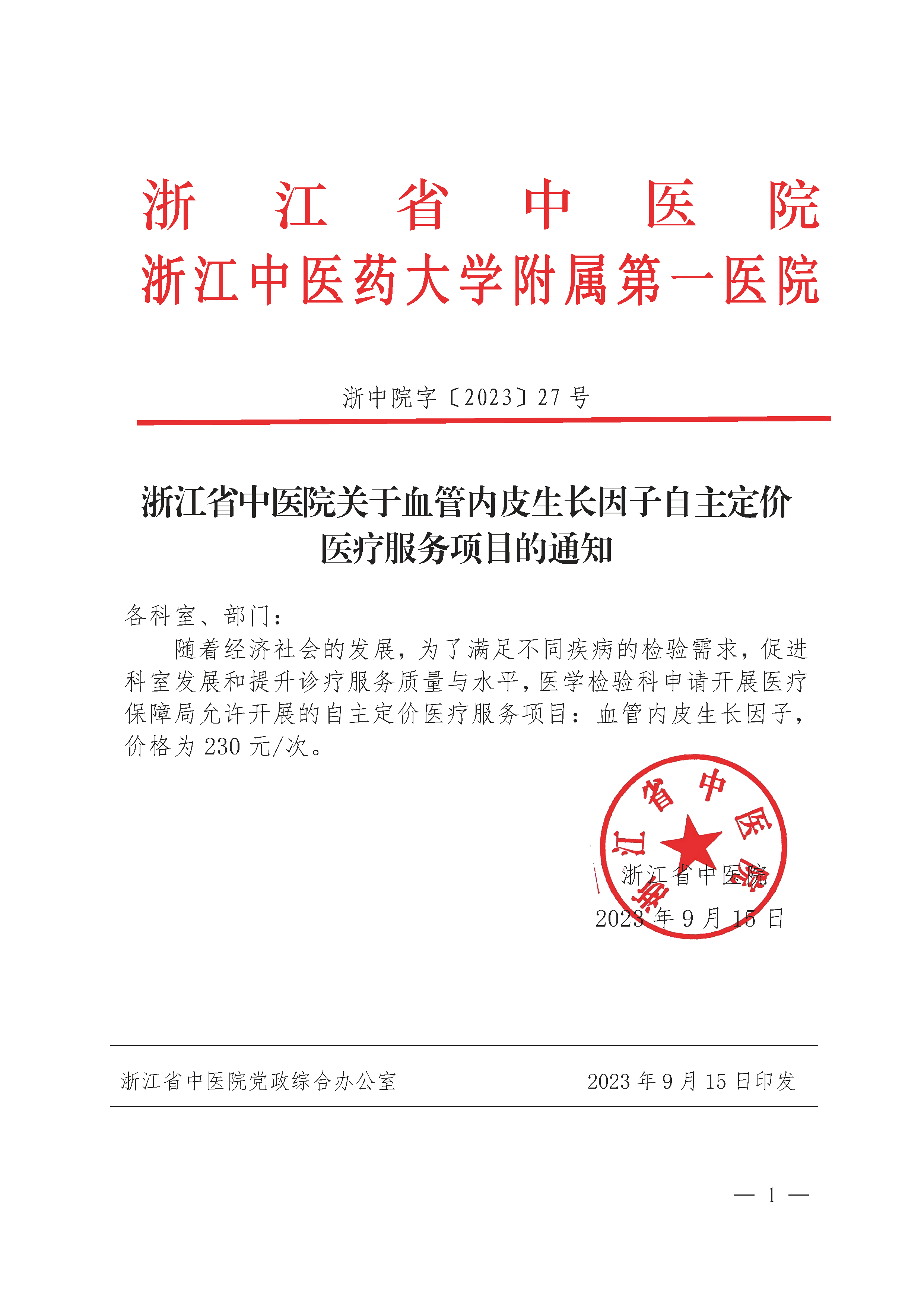 浙中院字〔2023〕27号 浙江省中医院关于血管内皮生长因子自主定价医疗服务项目的通知