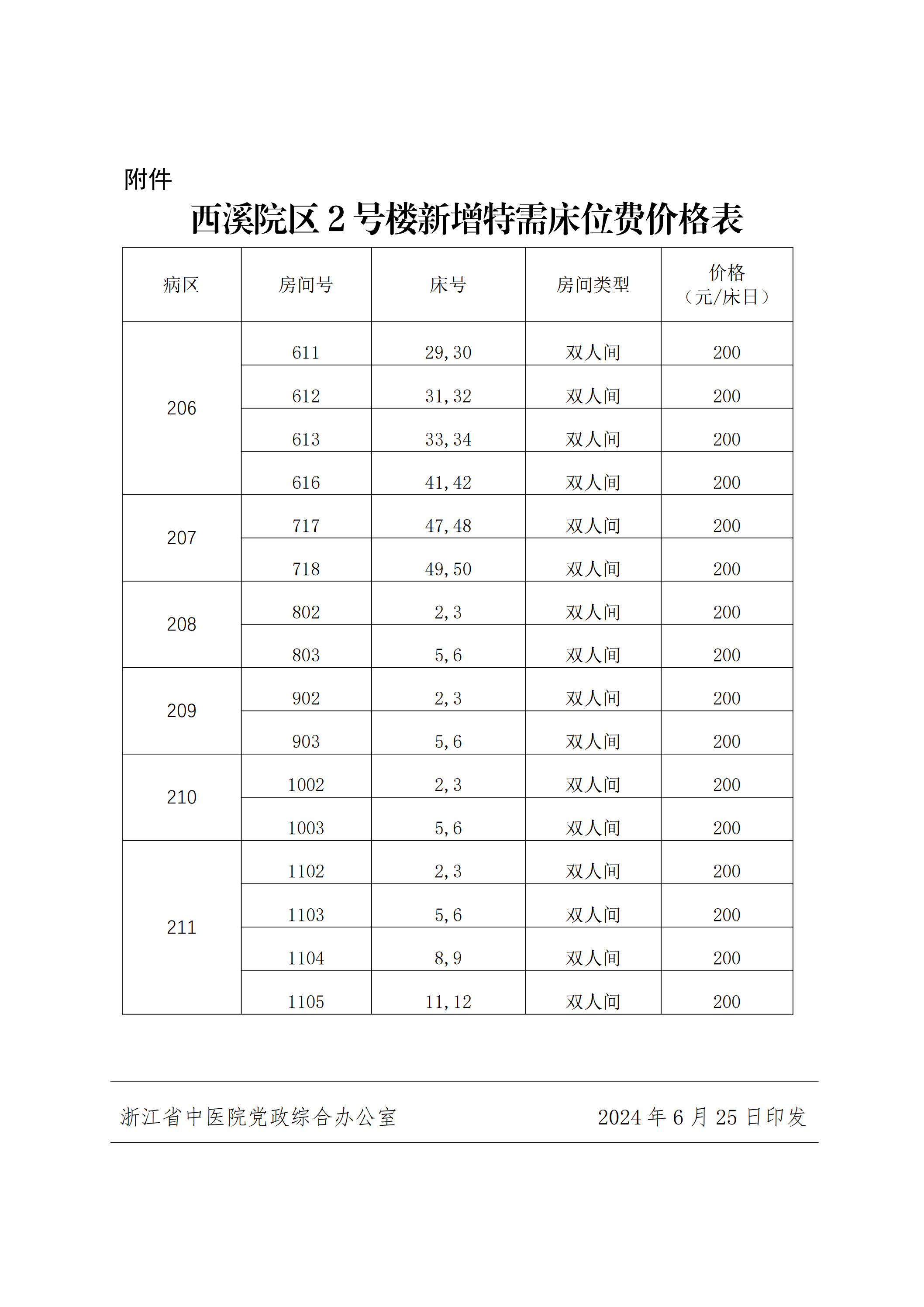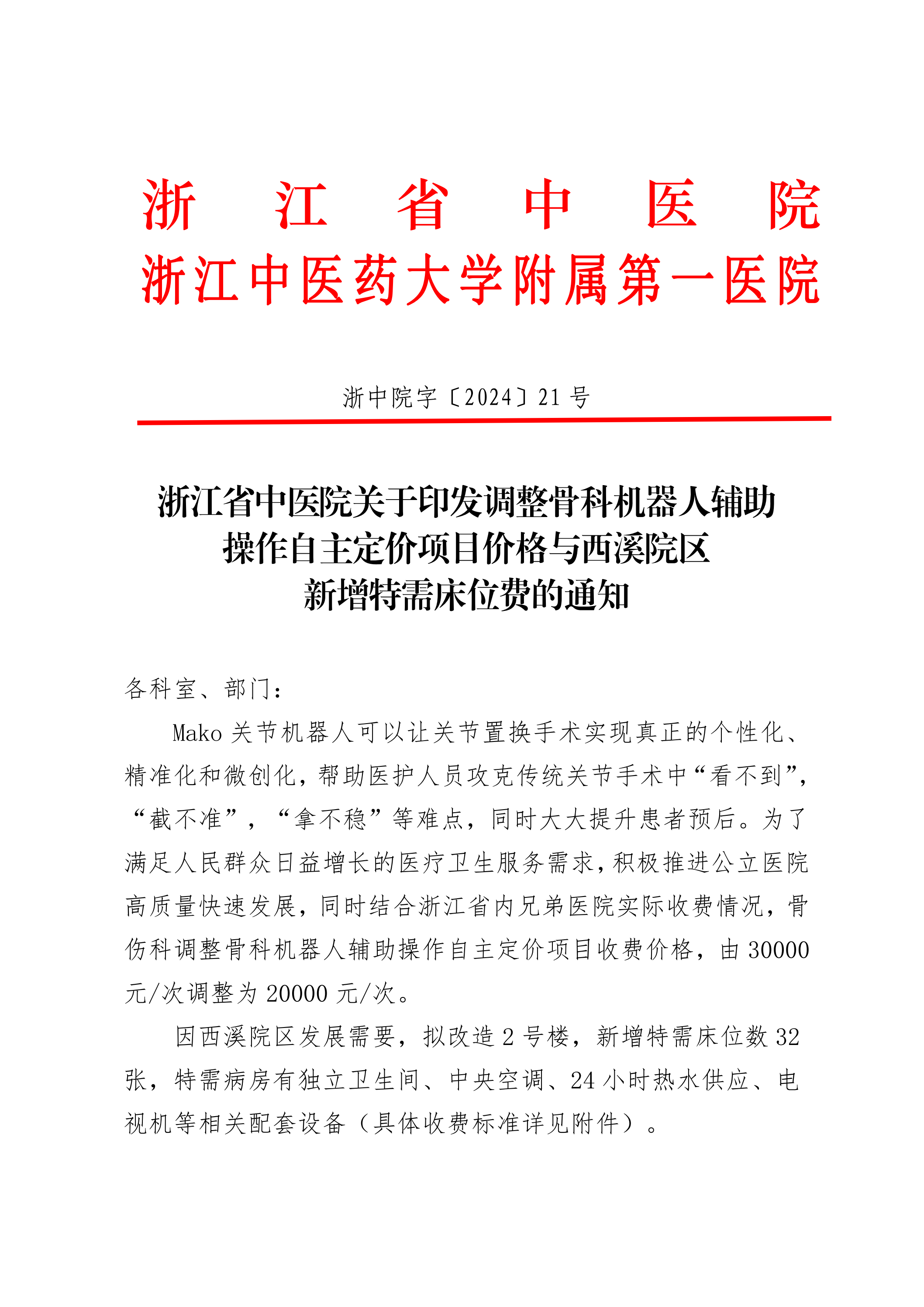浙江省中医院关于印发调整骨科机器人辅助操作自主定价项目价格与西溪院区新增特需床位费的通知