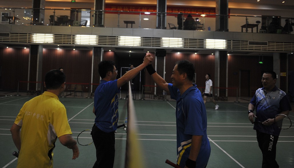 12月13日下午进行的是羽毛球半决赛和决赛。随着女单、男单、男双及混双四强选手的陆续到来,杭州市工人文化宫羽毛球馆内的气氛随之变得紧张而活跃。他们个个有备而来,无论是装备,还是气势丝毫不亚于专业选手。女单、男单首先开战,紧接着男双、混双激烈展开。最精彩的依旧是男双,医院办公室陈智能主任和朱奕豪副主任是男双搭档,两位主任将平日工作中的默契与合作在赛场上发挥得淋漓尽致,并顺利晋级。决赛中,这对“闪亮搭档”经过几番苦战,最终不敌供应室梁翼和下沙院区财务科寿江这对经典老搭档,在冠亚军争夺赛中屈居第二……