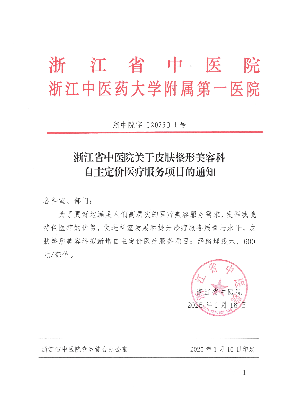 浙中院字〔2025〕1号 浙江省中医院关于皮肤整形美容科自主定价医疗服务项目的通知