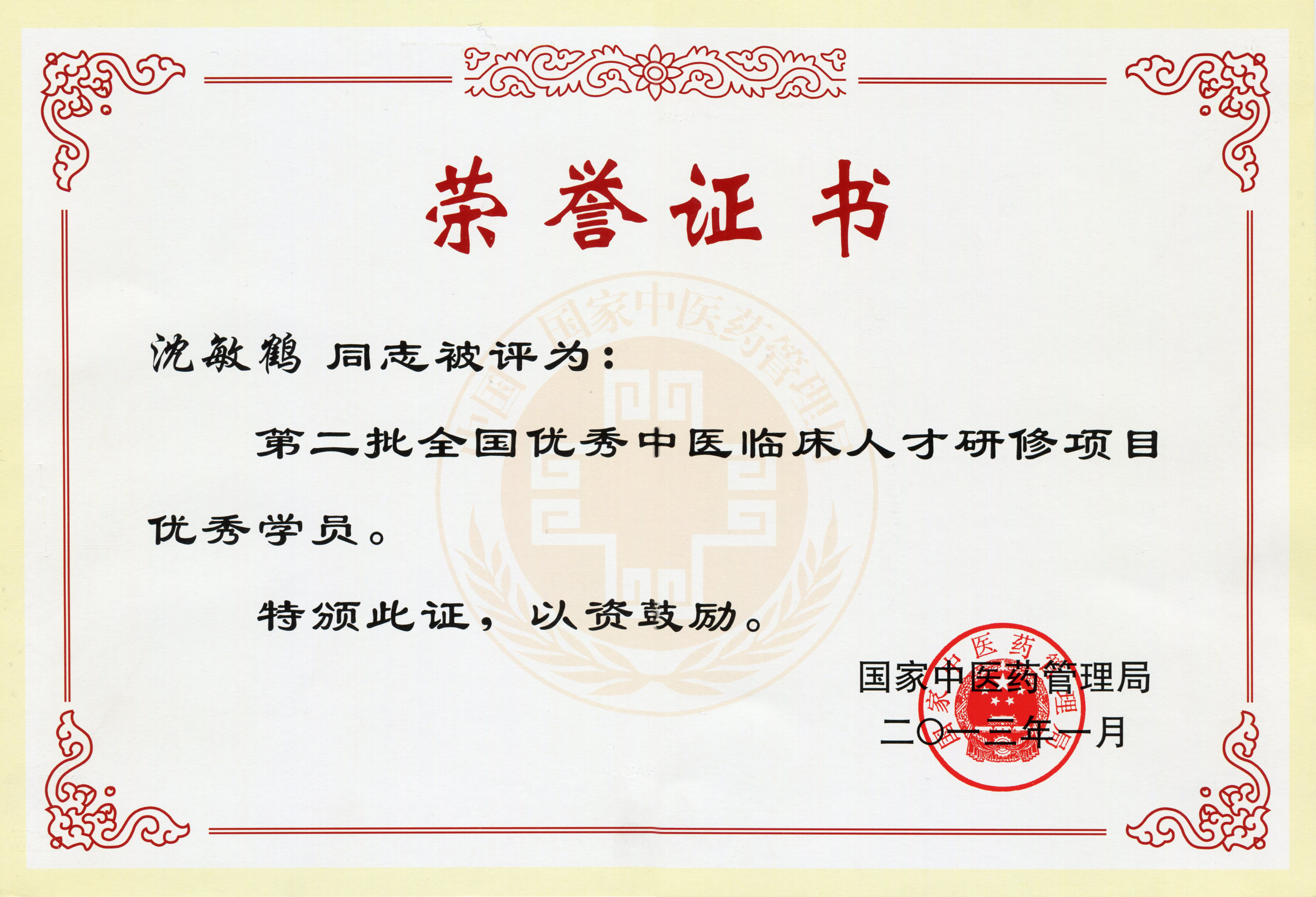 我院沈敏鹤副院长荣获第二批全国优秀中医临床人才研修项目优秀学员