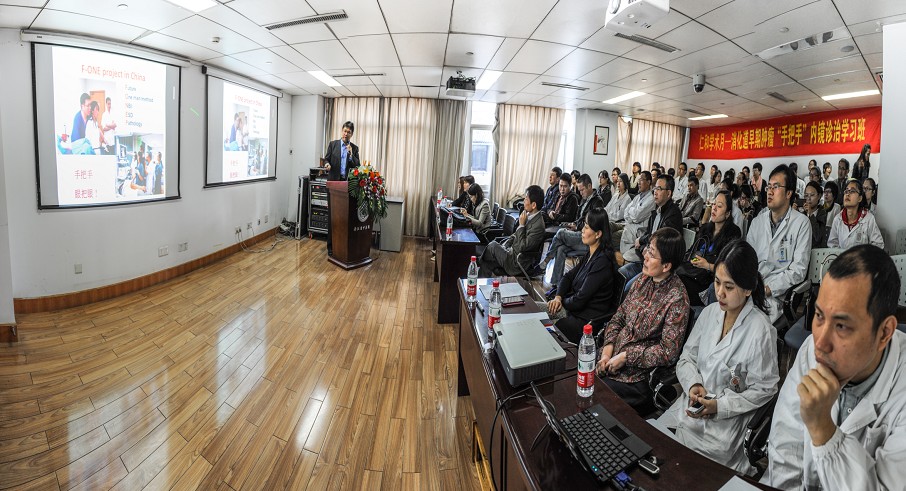 本次大会围绕消化道肿瘤的早期诊断及治疗,结肠镜单人检查法培训、经内镜粘膜下剥离术等进行了从理论到实践的培训。傅光儀教授关于《NBI及放大内镜在消化道肿瘤早期诊断中的作用》的精彩讲演,使得我们对NBI及放大内镜在消化道疾病、尤其是在早癌诊断中的应用和各种病变在镜下的改变有了新的体会,对ESD在消化道肿瘤中应用的适应症及操作技巧有了进一步认识。结肠镜单人操作示范及现场指导实际操作为提高我院内镜检查手法的提高起到重要的作用。在“手把手”内镜操作病例演示中将我院搜集了的经典或疑难病例同傅光儀教授及各参会同仁讨论,医院提供的病例质量及诊断水平得到傅光義教授的充分肯定。