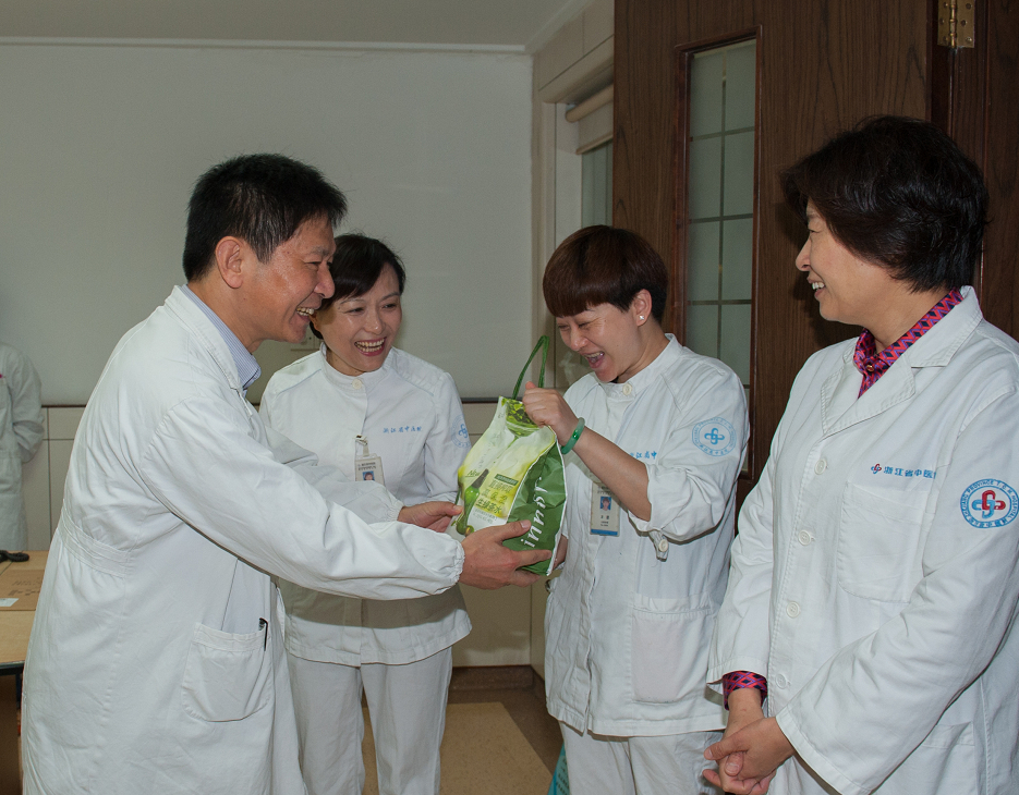 5月12日一早,院领导们便分成四个小组,分别来到各病区护理单元和门诊进行慰问。每到一个科室,院领导们都与护理人员亲切握手交谈,同时送上一份祝福、一份暖心礼品和一盆象征“热情、关心”的盆栽。在紧张而又忙碌的一天即将开始的时刻,亲切的握手、温暖的问候给天使们带来了巨大的安慰与鼓舞,同时也激励了护理人员继续弘扬南丁格尔精神,始终秉持“爱心、责任心、将心比心”的服务理念为病人、为患者提供更加优质的护理服务,为不断提升浙江省中医院的品牌价值而继续努力奋斗。