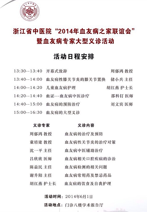 我院将于6月1日举办血友病专家大型义诊活动暨“2014年血友病之家联谊会”