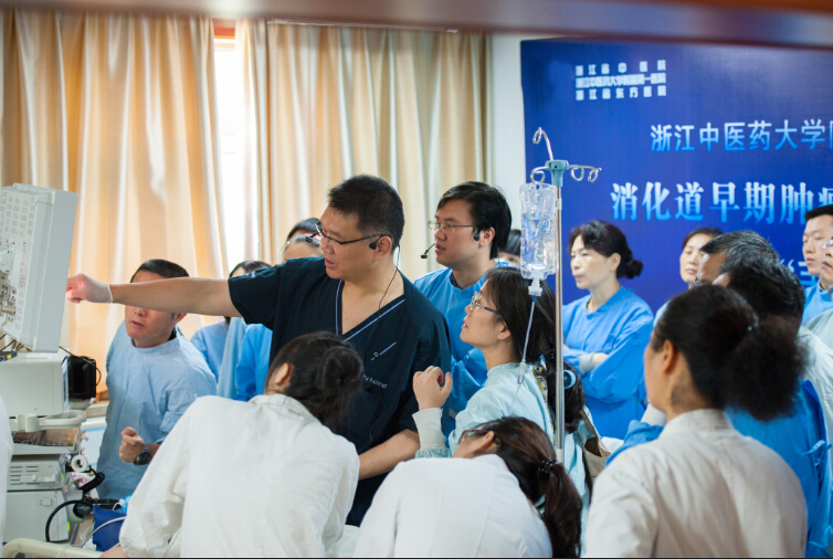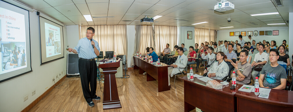 家住上虞的王大伯患慢性萎缩性胃炎很多年,近来常常感到上腹隐痛,很担心自己得了胃癌,在当地医院做了胃镜,发现胃窦一片孤立糜烂,无法确定是否是癌。王大伯慕名来到我院消化科求诊,适逢消化内科举办消化道早癌诊治学习班,结果我院消化内科专家火眼金睛,通过放大内镜结合窄带内镜技术,竟然在王大伯的胃内发现3个癌病灶,幸好均处于早期状态,经过半个小时左右,3个胃癌灶在胃镜下被完整地切除。众所周知,常规的内镜检查对消化道中晚期癌诊断较容易,但早期癌及微小癌易漏诊。早期癌及微小癌在内镜下仅表现为粘膜粗糙不平,活检具有极大的随意性,造成了诊断准确率不高,无法满足早期癌变筛查的需要。为进一步提高我省同道消化道早癌的诊疗水平,7月12日,由我院消化内科主办的消化道早癌诊治及“手把手”消化内镜操作技法高级培训班在我院举行。培训班特别邀请国际著名内镜诊治专家、日本菅间纪念病院傅光儀教授来院讲学,并予消化道早癌诊治与NBI放大内镜操作的手把手指导。来自杭州、宁波、绍兴、嘉兴、温州、金华地区近20家医院50余位中高级消化内科和消化内镜医生参加了本次活动,并接受了手把手教学。