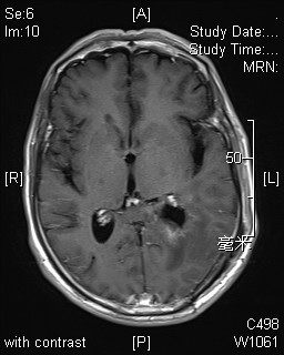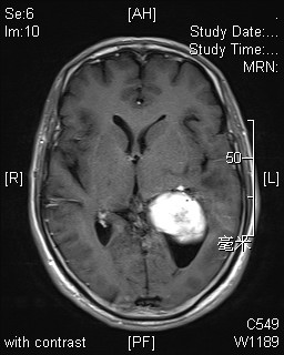 患者男性,62岁,因“反复头晕半月余”入院,颅脑MRI提示:左侧侧脑室肿瘤伴脑室周围脑水肿。肿瘤大小约5*4*4厘米。