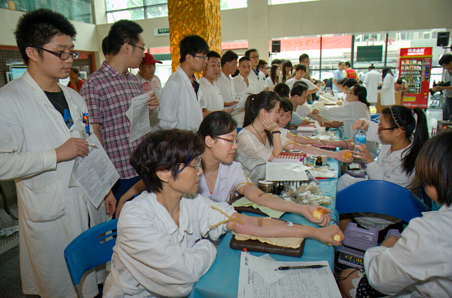 受冰桶挑战启示,医院联合《钱江晚报》发起了一场轰轰烈烈的“爱心献血生命接力”活动。自8月25日,医院副院长江荣林带头献血,然后通过微信“点名”的方式,3天来在全院掀起了一股热潮,被“点名”的,未被“点名”的纷纷参加献血,并扩散点名范围。8月28日当天,全院211名医护人员和行政、后勤各岗位人员献出了热血,总献血量达50000毫升,刷新了医院史上单日献血量纪录。
