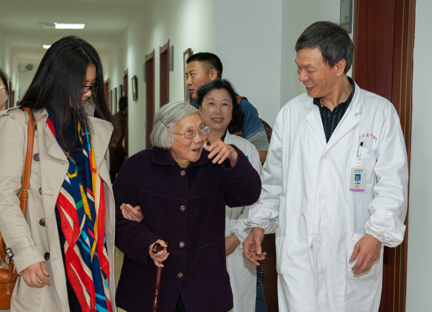 卢奶奶在江院长陪同下走出会议室