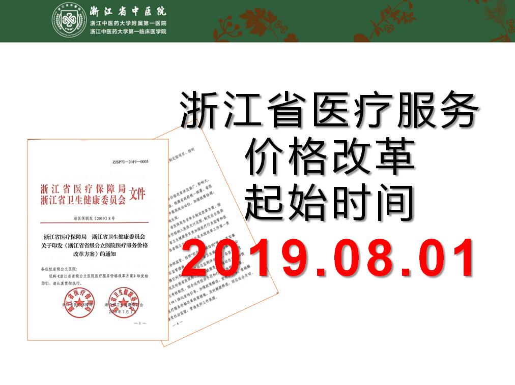 浙江省医疗服务价格改革起始时间2019.08.01 具体内容详见医疗保障局官网 网址:http://ybj.zj.gov.cn/art/2019/7/1/art_1615796_35221491.html