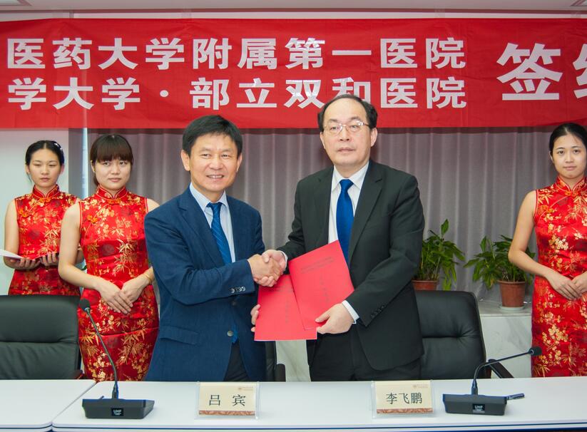 6月26日,是一个双喜临门的日子,一是85周年前的今天,医院正式宣告成立,二是85年后的今天,医院与台北医学大学?部立双和医院再次缔结“姐妹医院”关系。当天上午,双和医院院长李飞鹏与我院院长吕宾共同签署了协议并交换纪念礼物。医院党委书记曹毅、副院长祝亚男,党院办、医务部、护理部等部门负责人参加了签约仪式。 仪式上,吕宾代表医院对李飞鹏院长一行的到来表示欢迎。他介绍了医院的基本情况并回顾了自2013年1月两院建立“姐妹医院”以来彼此加强交流,不断加深情谊的点滴往事。吕宾说,双和医院在医院管理、医疗技术、医院文化等领域有许多值得学习和借鉴之处,建立姐妹医院以来,我院多次选派管理与业务骨干赴台学习,深受双和医院领导和同道指教与照顾。同时,双和医院领导与专家每年都来我院授课、讲学,帮助医院员工更新理念,改进工作。两院间还不断加强互动,在双和医院建院5周年时,医院总会计师率队赴台共同庆祝,分享喜悦。今年,我院建院85周年,李飞鹏院长亲自来院出席“2016仁和整合医学论坛”并为参会的1000多名省内外同道授课,进一步加深了双方的友谊。他相信,随着“姐妹医院”关系的进一步加固,今后在医院管理、医疗服务、中西医学交流等方面一定能不断深入开展,惠及海峡两岸同胞。