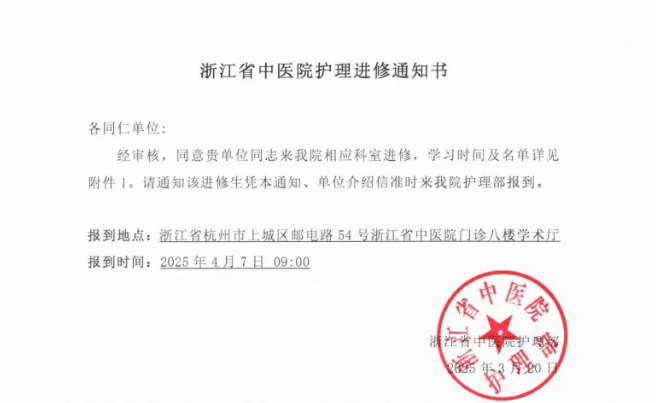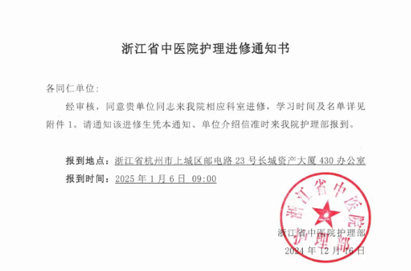 浙江省中医院护理进修通知书
