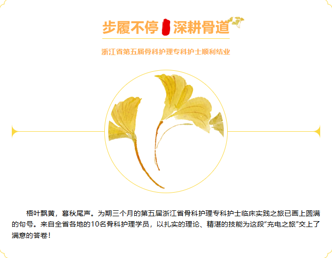 梧叶飘黄,暮秋尾声。为期三个月的第五届浙江省骨科护理专科护士临床实践之旅已画上圆满的句号。来自全省各地的10名骨科护理学员,以扎实的理论、精湛的技能为这段“充电之旅”交上了满意的答卷!