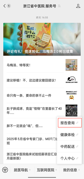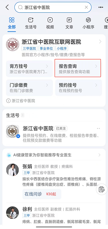操作流程:支付宝APP→浙江省中医院互联网医院→报告查询