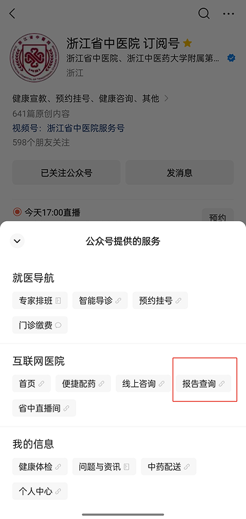 操作流程:关注公众号→互联网医院→报告查询